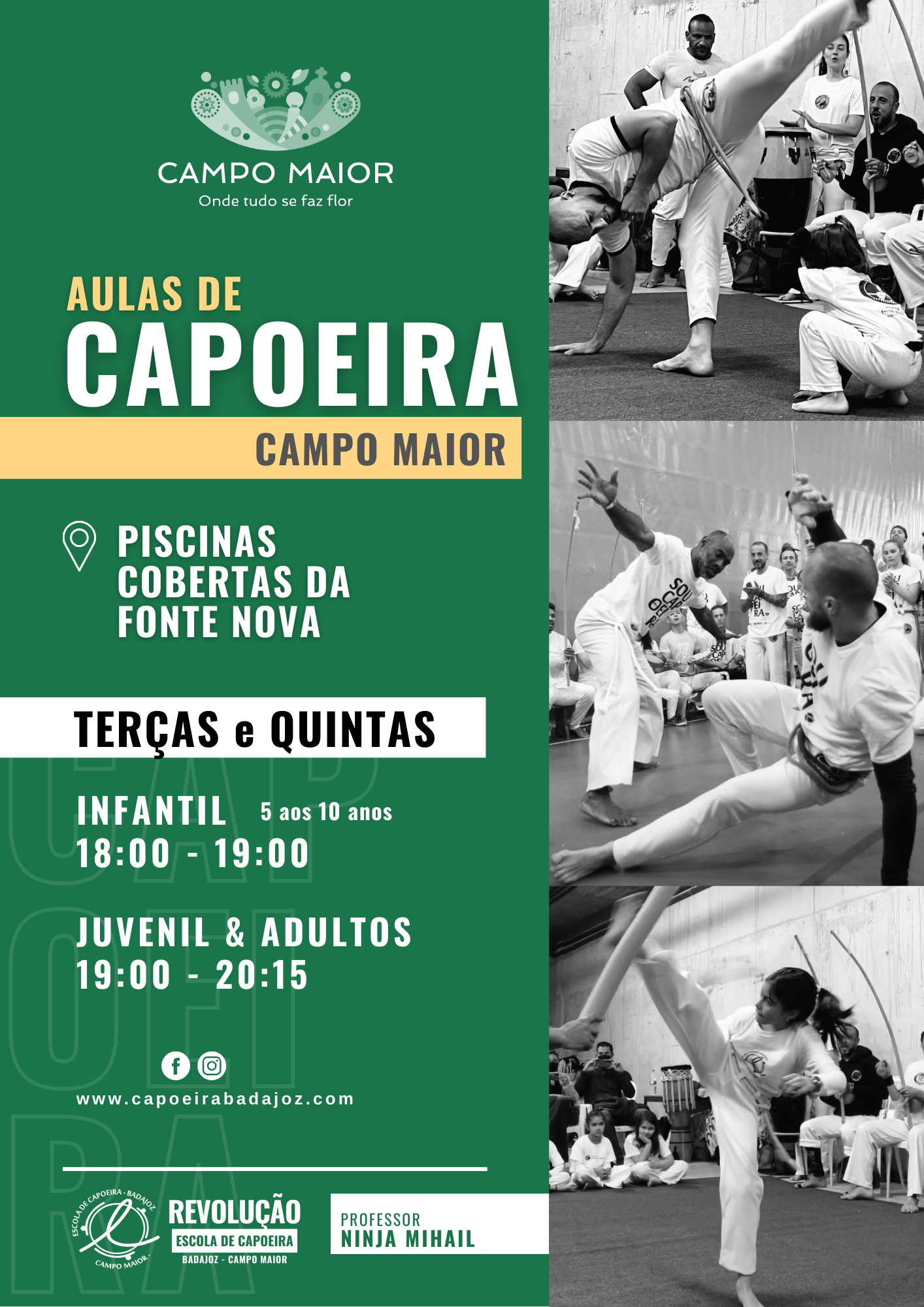 Aulas de Capoeira nas Piscinas Cobertas da Fonte Nova terças e quintas-feiras das 18:00H às 19:00H para alunos dos 5 aos 10 anos e das 19:00H às 20:15H para juvenis e adultos.